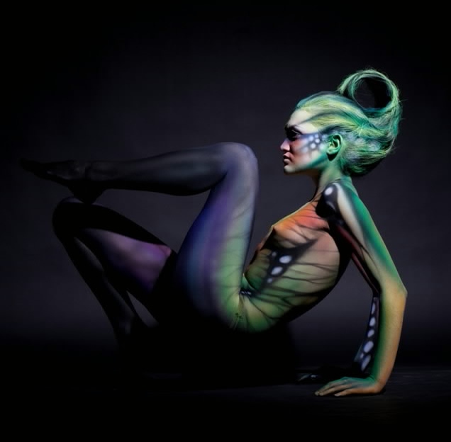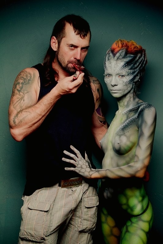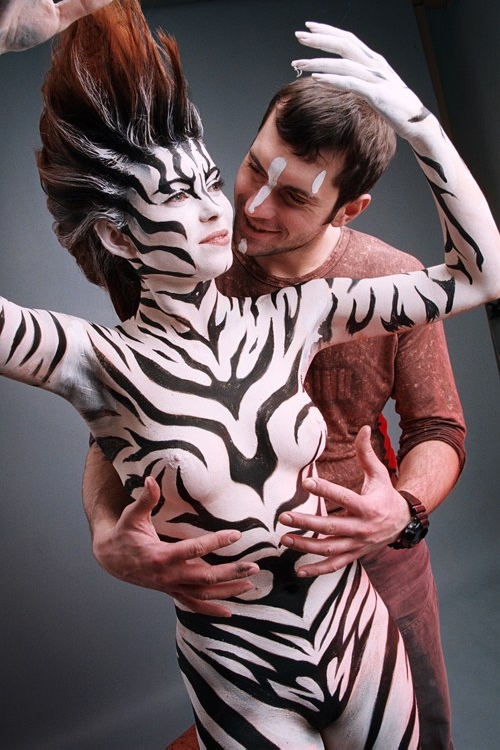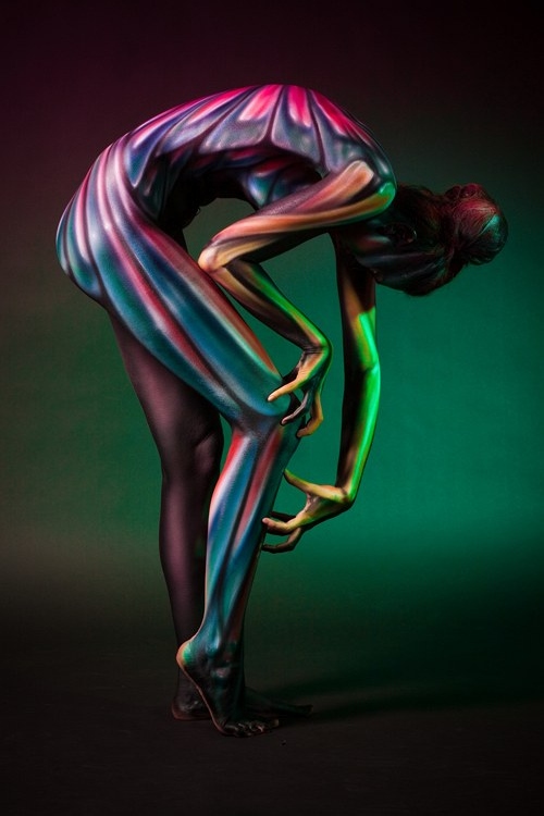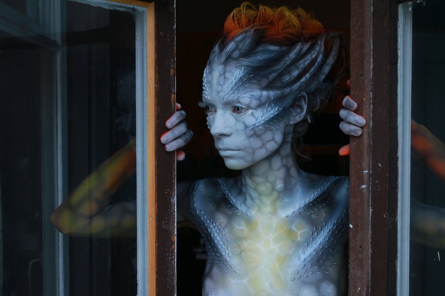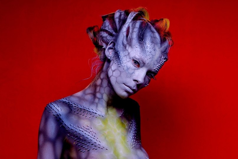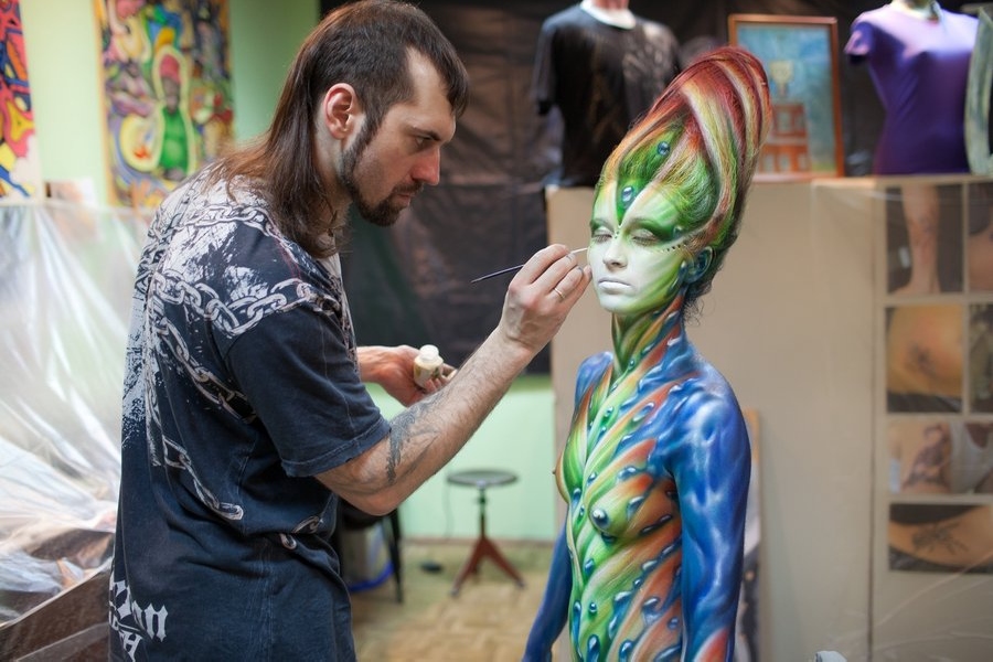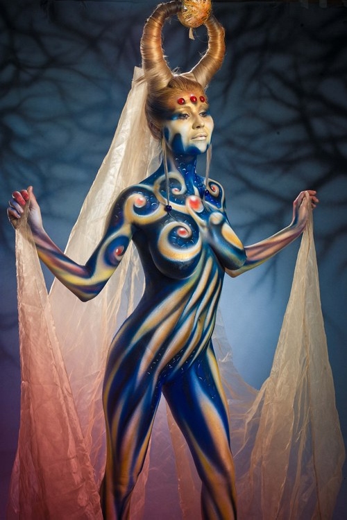 Бодипеинтинг не основное направление творчества Михаила, но его работы по росписи тела вызывают восхищение и восторг. Несомненно, его фирменным стилем является создание объемных форм с помощью аэрографии за счет оптического обмана. Нарисованная чешуя и капли воды выглядят настоящими.