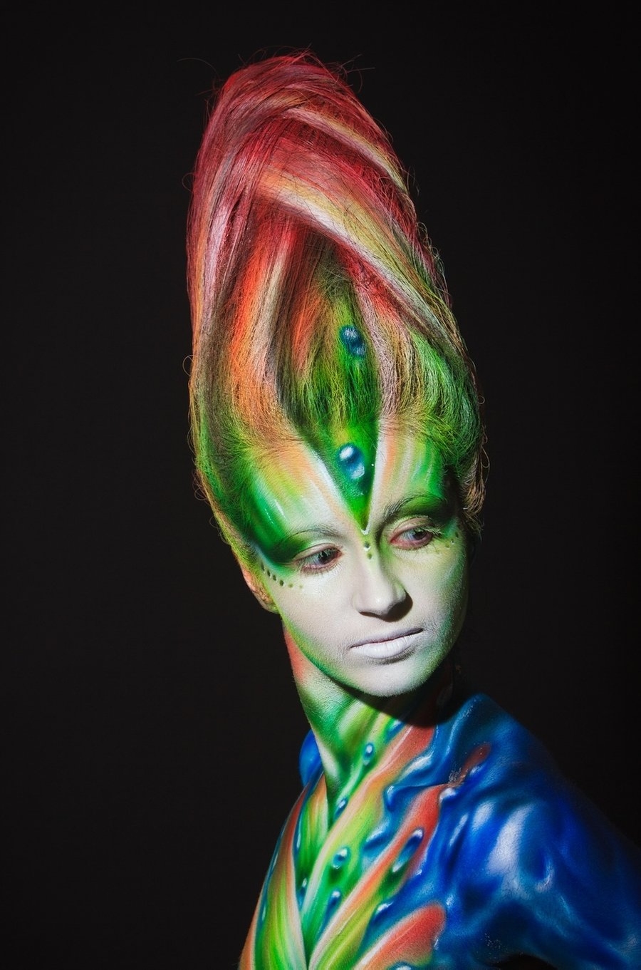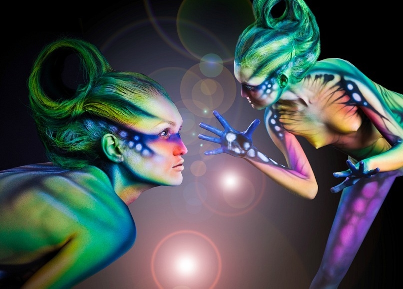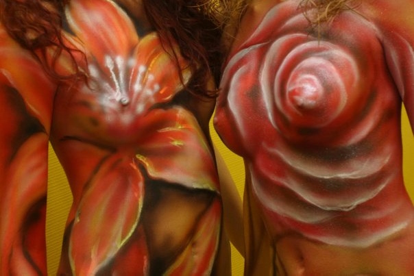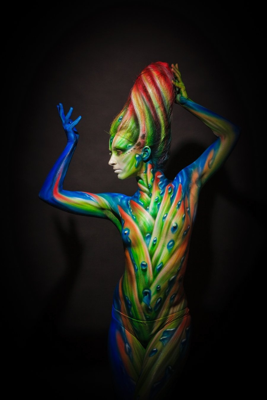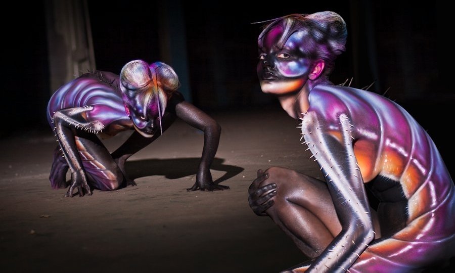 Бодипеинтинг не основное направление творчества Михаила, но его работы по росписи тела вызывают восхищение и восторг. Несомненно, его фирменным стилем является создание объемных форм с помощью аэрографии за счет оптического обмана. Нарисованная чешуя и капли воды выглядят настоящими.
