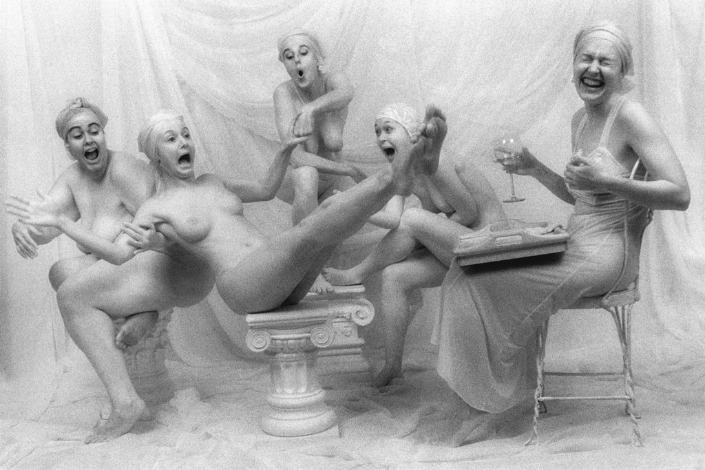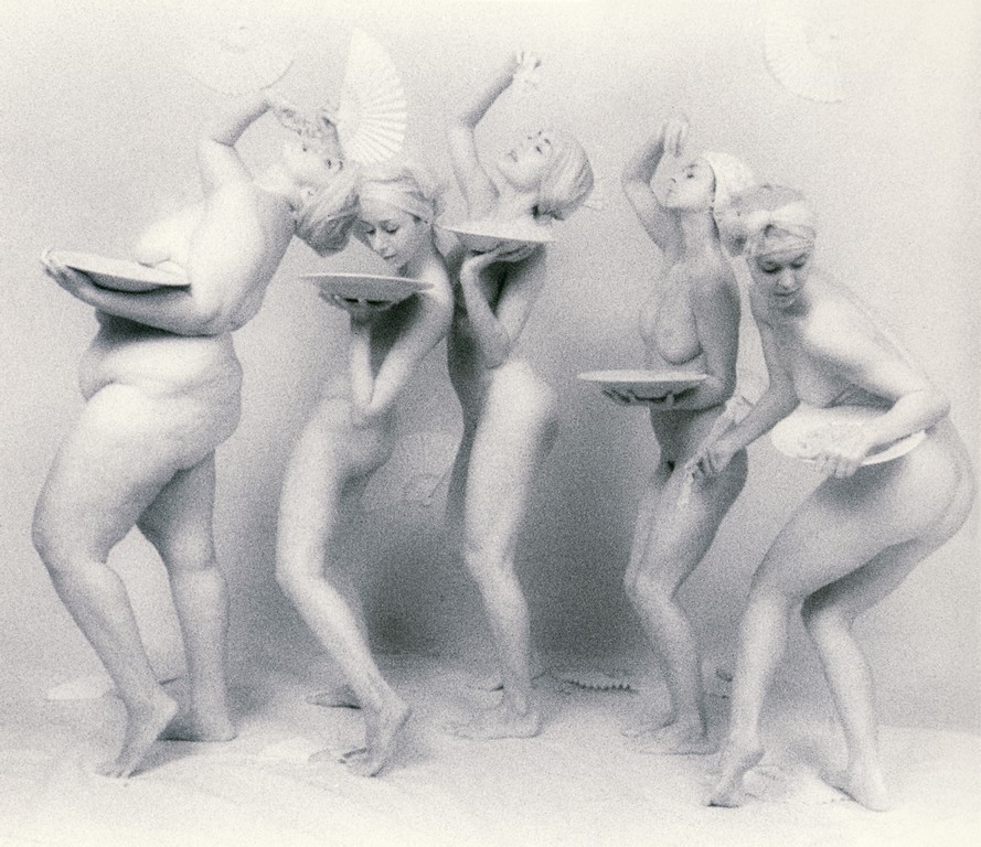 Другой концептуальный американский автор Линн Бианки предлагает тоже достаточно интересную серию, но идея которой не столь прозрачно выражена, как у предшествующего художника. Обнаженные женщины с тарелками в самых разнообразных позах и композициях. Если честно, то при просмотре складывается впечатление чрезмерного неукротимого потребления, не важно чего – будь то продукт питания, модные гаджеты, одежда и пр. Например, одна из девушек во время застолья приложила чайник к уху, другая – кружку, имитируя разговор по телефону. А вот –толстуха ест из тарелки, которую унижено – на коленях – ей предлагает худышка. Казалось бы, образ порабощения, нашей зависимости, в глобальном понимании. Но нет – в аннотации мы читаем: «Серия отражает увлечение Линн понятием красоты <…> Образы женщин различной массы и формы красивы. Они отражают внутреннее удовлетворение собой, отсутствие стыда».