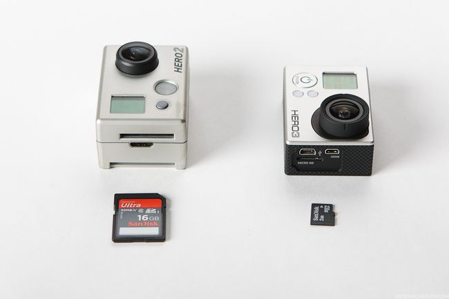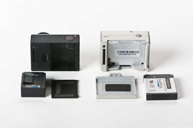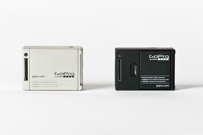 На обратной стороне разместился разъем для аксессуаров - батарейного блока или LCD-экрана. Эти аксессуары от Hero 2 подходят без проблем. Аккумулятор камеры стал компактнее, но емкость литиево-ионного аккумулятора составляет 1050 мА/ч, что на 50 мА/ч меньше, чем у Hero 2. Крышка батарейного отсека тоже пропорционально уменьшилась, и получила новый фиксатор. Также уменьшился формат карты памяти: вместо стандартной SD, третья камера снимает на Micro SD - максимальная емкость карты 64 гб, против 32 у прошлой версии. Все модели Hero третьего поколения получили новую 6-и элементную асферическую оптику. Новый объектив делает картинку более четкой и дает меньшие искажения по краям кадра.