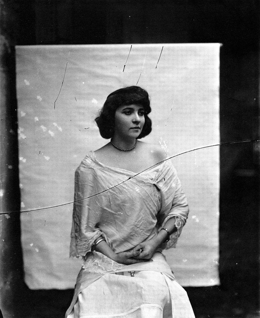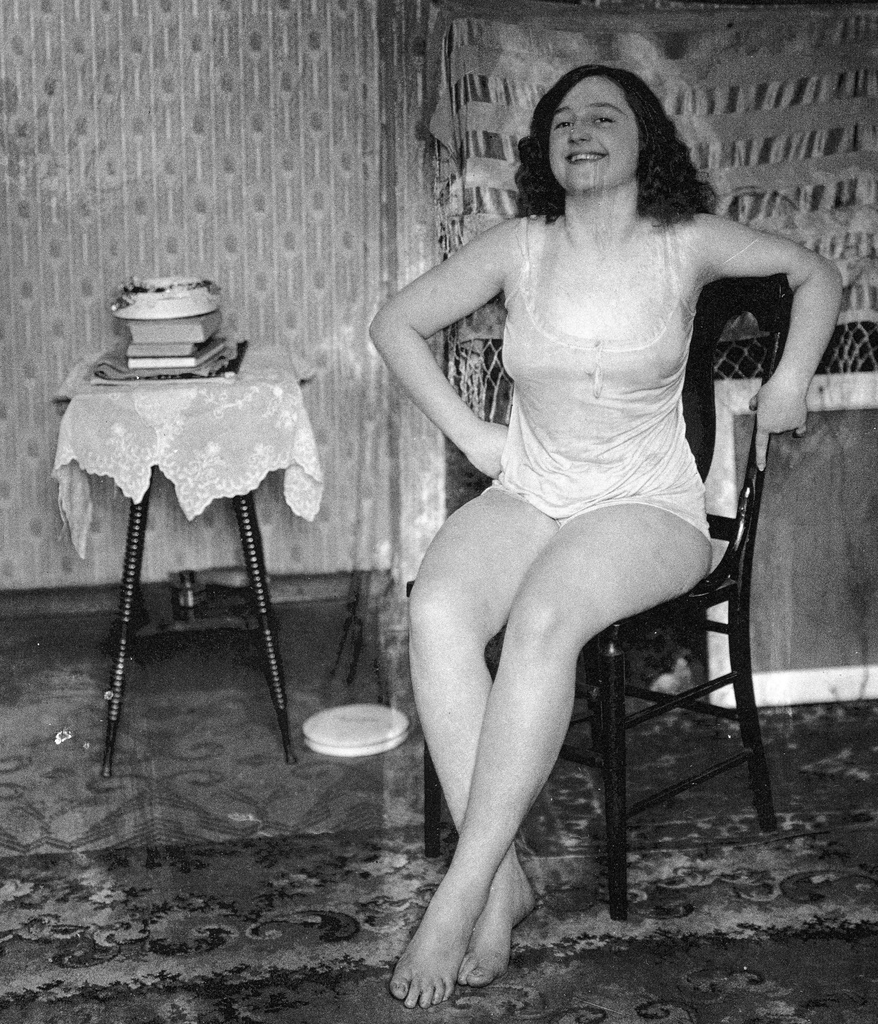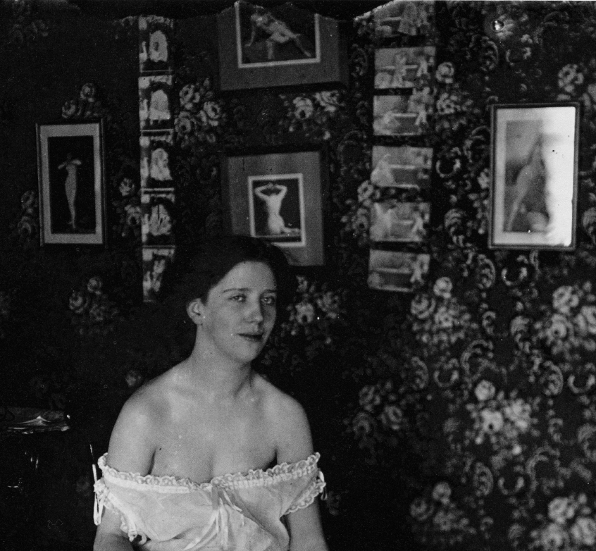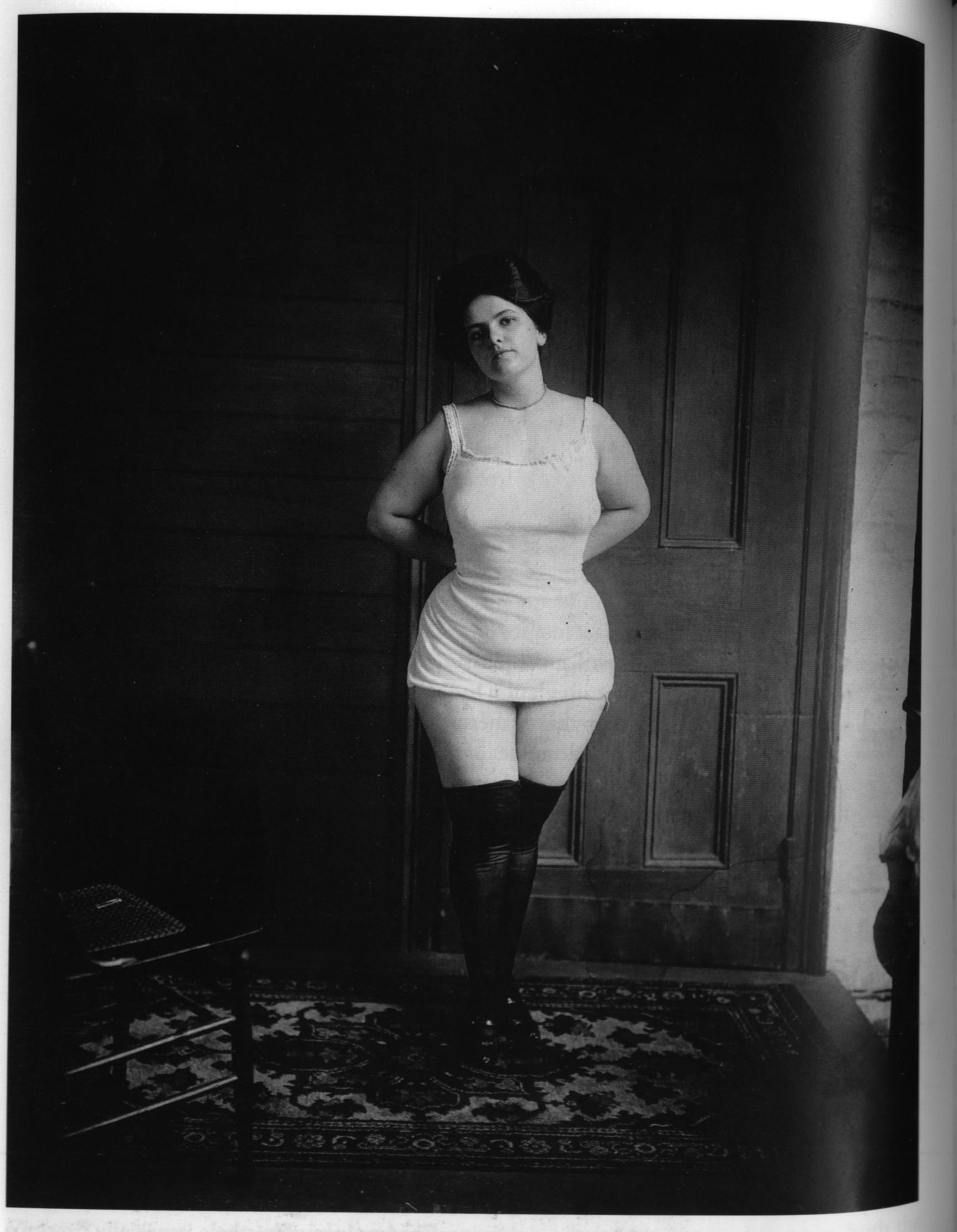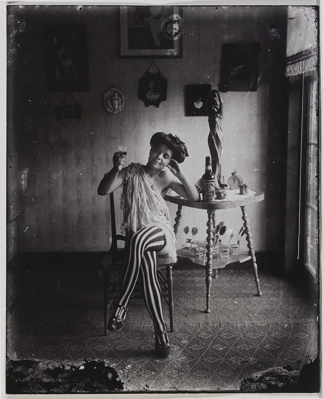 Не все фотографии четко артикулируют соответствие своего персонажа обитателю борделя. Так, на одной фотографии женщина в большой шляпе с перьями, белой блузке с длинными рукавами, украшенной брошкой и медальоном, и в черной юбке сидит во дворе перед черным фоном, за которым мы видим сохнущие потертые полотенца. На других фотографиях – на которых женщины изображены в белье – принадлежность к древней профессии читается более явно. Вот модель позирует в кресле, ее руки сплетены за головой, одета она в комично выглядящее трико. Любопытно, что большинство обнаженных девушек позируют с непретенциозной искренностью, и более того – выставляя напоказ непретенциозное тело. Они как будто не понимают, зачем разделись перед камерой. Только на некоторых снимках портретируемые приняли чувственные позы, как на фотографии юной одалиски с длинной косой. Или – красивая женщина соблазнительно откинулась в шезлонге, на ней только черные чулки и маска зорро. Маску мы находим еще на одной фотографии: полностью голой женщины с большим животом, неловко сидящей на краешке деревянного стула. Маска кажется слишком большой для ее лица. В отличие от первой «замаскированной», полностью расслабленной, вторая кажется зажатой, даже расстроенной своей наготой. Некоторые модели принимают благородный вид, и тогда их эмоции трудно прочитать. Для других, без сомнения, позирование является игрой, развлечением: женщина в трико, с накинутой шалью, с бутылкой и поднятым бокалом, выглядит очень довольной.