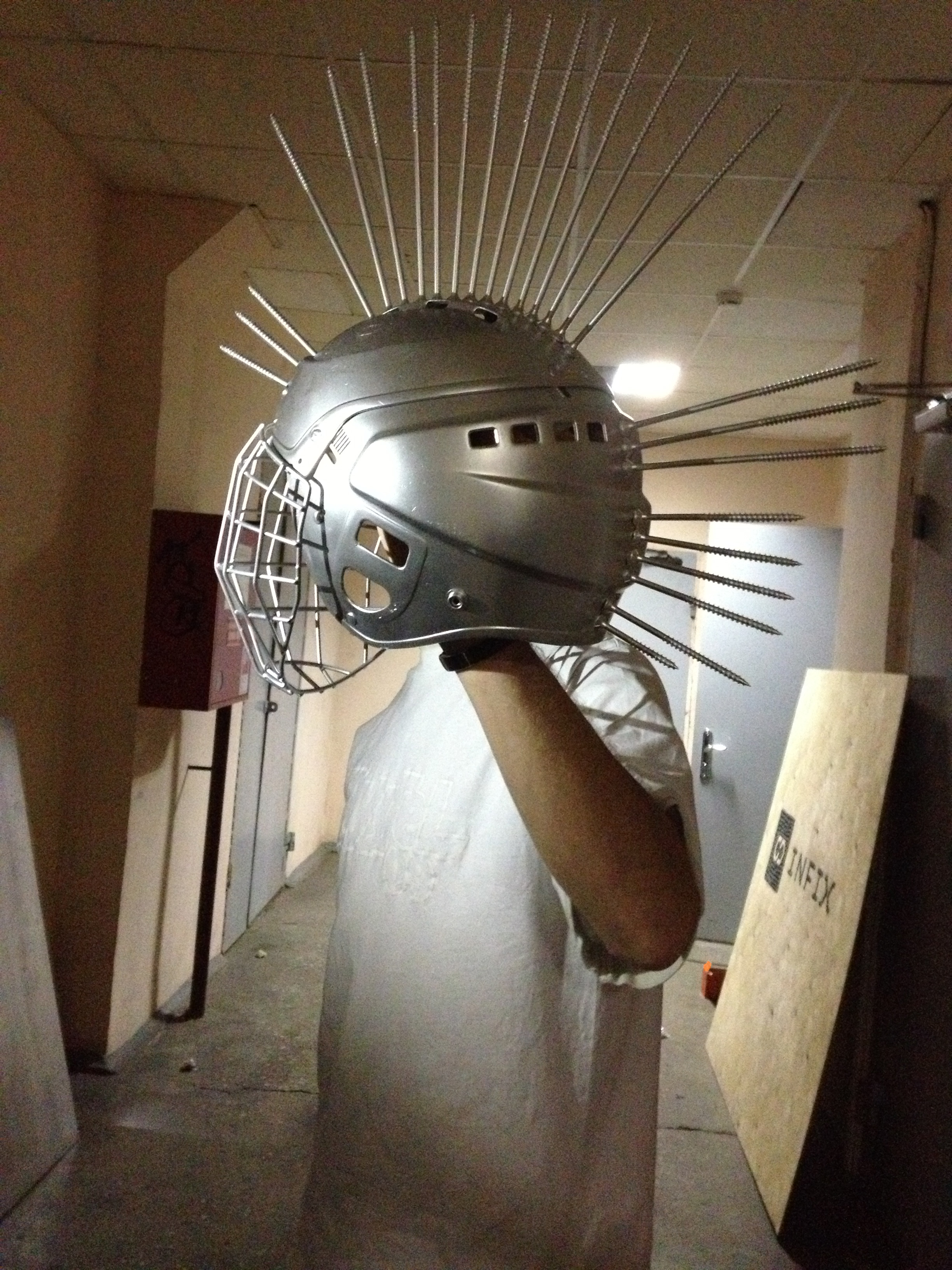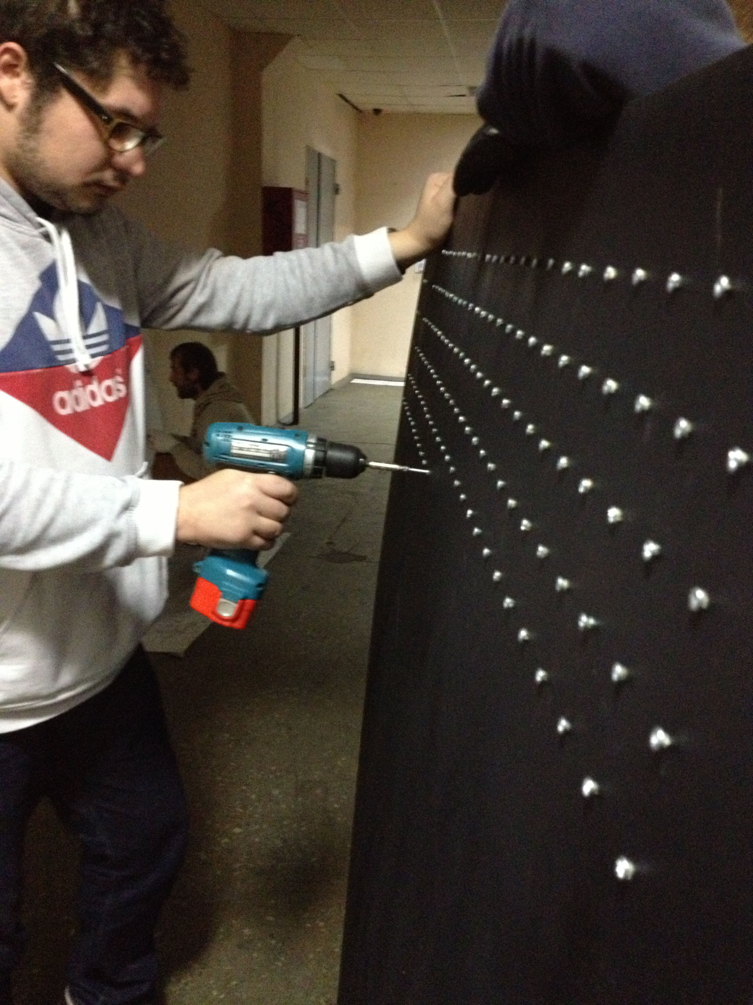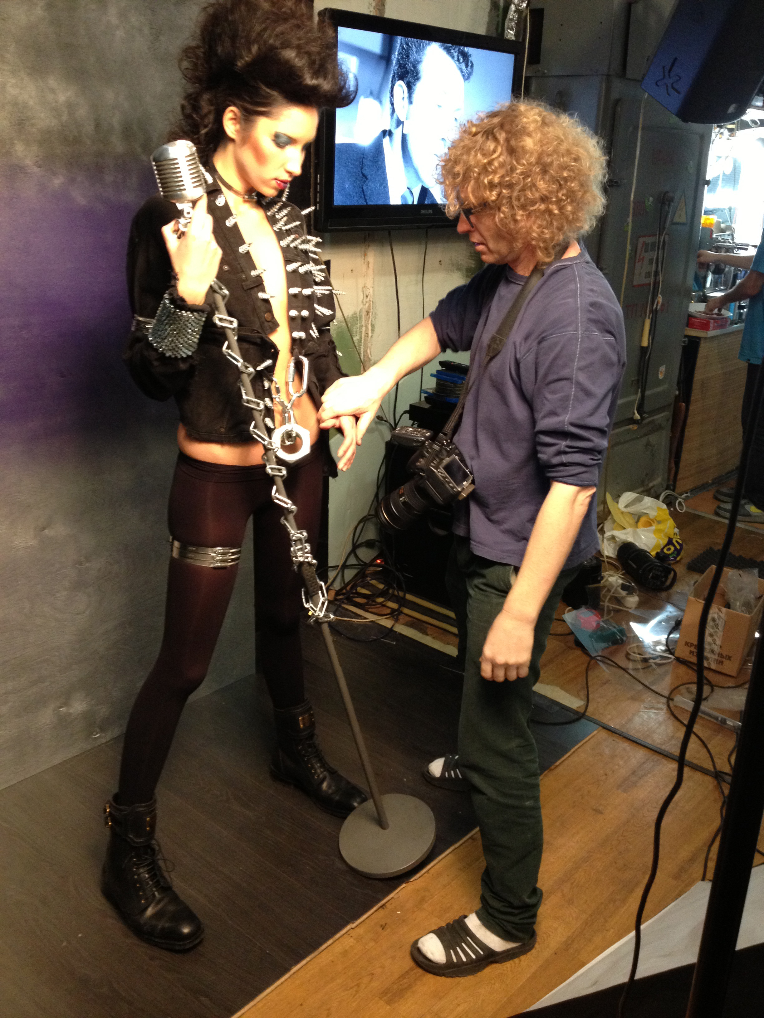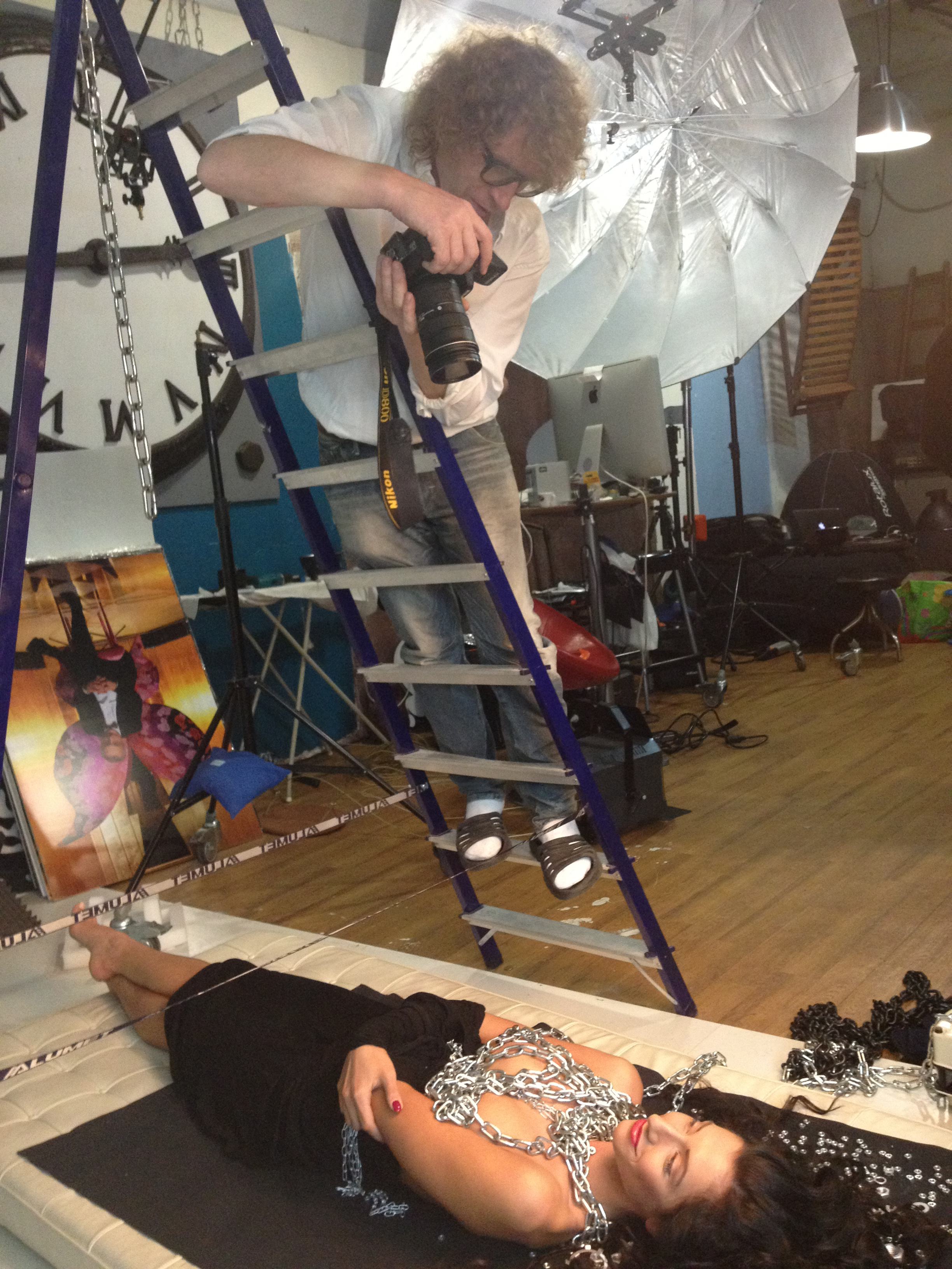 Например, в первый день съемки стометровая фотостудия Олега Зотова вся была затянута металлическими цепями и муфтами, а на следующий день - черным пластиком с несколькими тысячами шурупов и гвоздей (для крепежа которых потребовалось восемь часов).