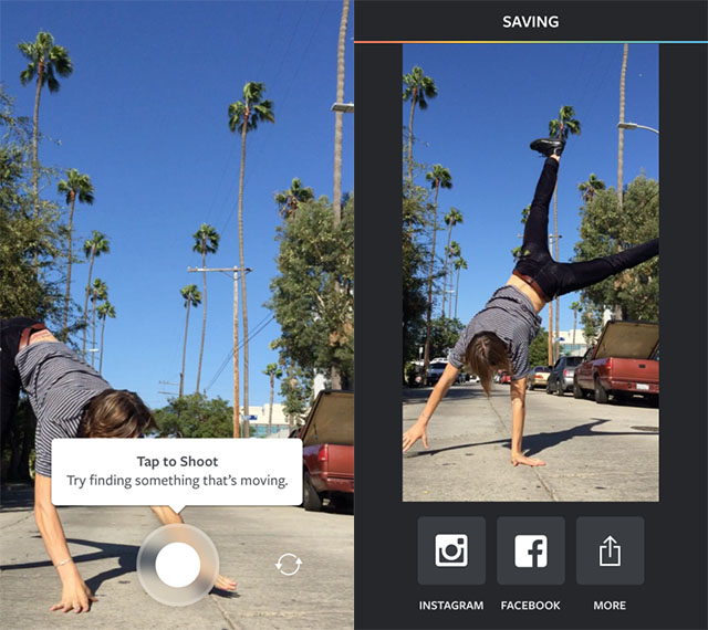 Приложение очень простое, не нужно даже логиниться. Нажимаете «кнопку спуска» и записываете последовательность снимков – с помощью любой из камер, тыловой или фронтальной. Приложение покажет вам итоговую анимацию, которая длится 1 секунду (получается, что воспроизведение сделано ускоренным примерно в два раза). Дальше вы можете отправить эту мини-анимацию в Instagram, Facebook или другие сети.