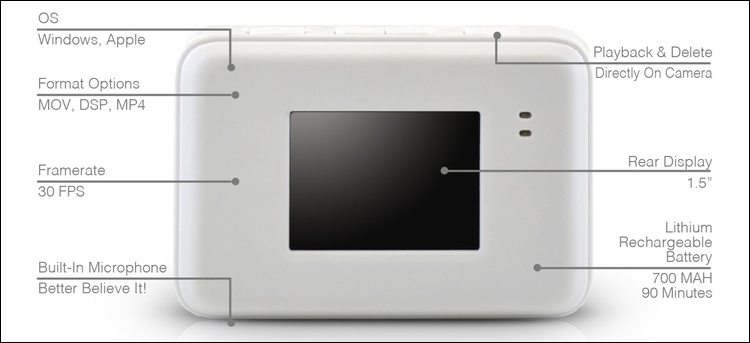 Компактное устройство позволяет делать 12-мегапиксельные фотоснимки, а также записывать видеоматериалы в формате 1080р (1920 × 1080 точек) со скоростью 30 кадров в секунду. Для хранения отснятого контента служит карта microSD (в комплект поставки войдёт носитель вместимостью 4 Гбайт).