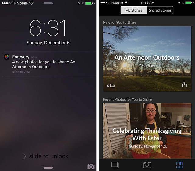 Forever автоматически группирует снимки в «рассказы» (stories), у которых есть обложка и заголовок. Вы можете делиться своими «рассказами» с друзьями и родными, причем приложение даже подсказывает, с кем именно можно поделиться, базируясь на прошлом опыте и на том, чьи лица были обнаружены на снимках.