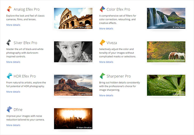 Набор Nik Collection включает в себя семь плагинов: Analog Efex Pro, Color Efex Pro, Silver Efex Pro, Viveza, HDR Efex Pro, Sharpener Pro и Dfine. Плагины дают широкие возможности редактирования снимков, в том числе имитация старых пленок и камер, ретушь и корректировка снимков, подстройка цвета и тональности, уменьшение шума и повышение резкости, съемка в HDR и так далее.