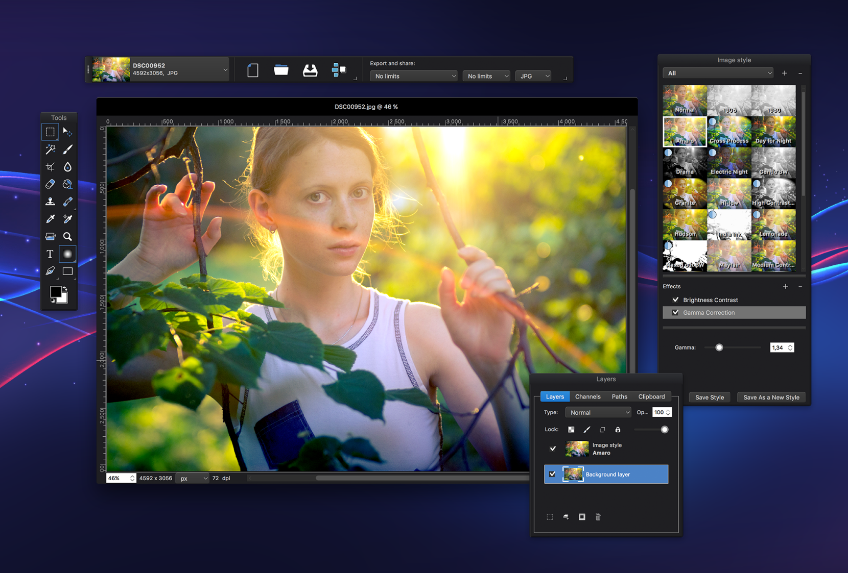 Фоторедактор Artipic дает возможность рисования, редактирования, ретуши и трансформации изображений. Инструментарий графического редактора включает цветовую коррекцию, фильтры, эффекты и операции со слоями и масками. Он работает с растровой графикой, поддерживает основные графические форматы – JPEG, PNG, TIFF, BMP и другие.