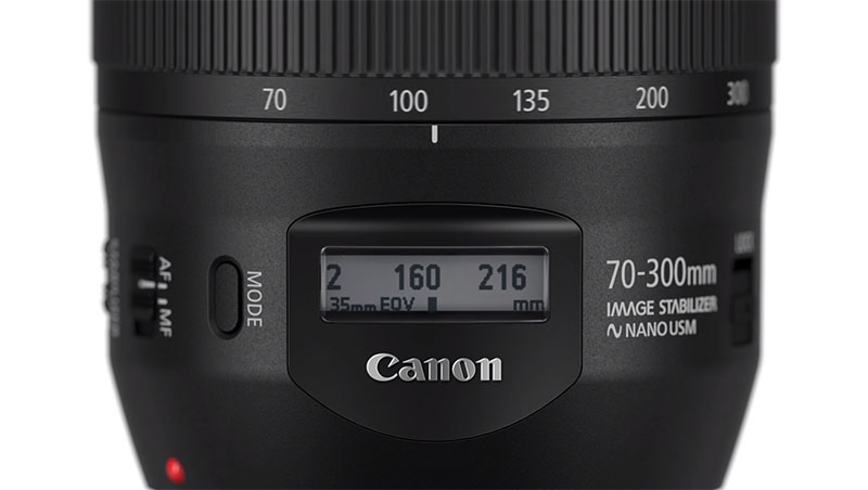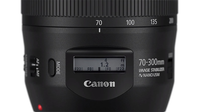 В основном режиме дисплей отображает шкалу расстояний и метки глубины резкости – фактически, это та информация, которую показывают механические индикаторы на ныне существующих объективах Canon.