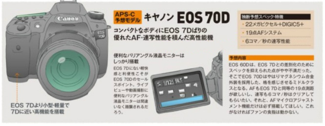 По мнению редакции журнала, фирма Canon собирается порадовать публику камерой 70D с поворотным экраном, 22 мегапикселями, 19 точками автофокуса и 6 кадрами в секунду, а так же подключиться к "гонке мегапикселей", развязанной Nikon, с камерой 3D - более 30 мегапикселей, 61 точка автофокуса, встроенная система управления вспышками, и, возможно, впервые на рынке зеркальных фотоаппаратов - запись видео в формате 4K.