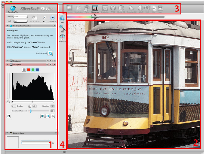 Сканирование в цвете возможно в режимах 24/48 битов на канал, а в градациях серого — 16 битов. Сканер может похвастать хорошим показателем динамического диапазона, вплоть до значения 4.01 (подтверждено при использовании с ПО SilverFast Multi-Exposure). Собственно, программным обеспечением SilverFast сканер и укомплектован, прилагается пакет Ai Studio 8.
