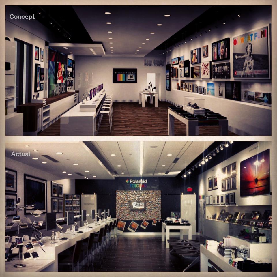 Polaroid открыл первый фотобар — магазин-салон для печати фотографий. Предлагается как печать фотографий в стиле фотоснимков с камеры Polaroid, с белой рамкой, так и либые другие виды печати, в том числе на тканях, дереве, металле. О проектах подобных Fotobar'у Photonews сообщал и раньше. Вот как выглядят проект салона, смоделированный на компьютере, и реально построенный Fotobar:
