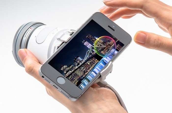 Olympus Air A01 можно прикрепить к корпусу смартфона и соединить при помощи беспроводного интерфейса связи.