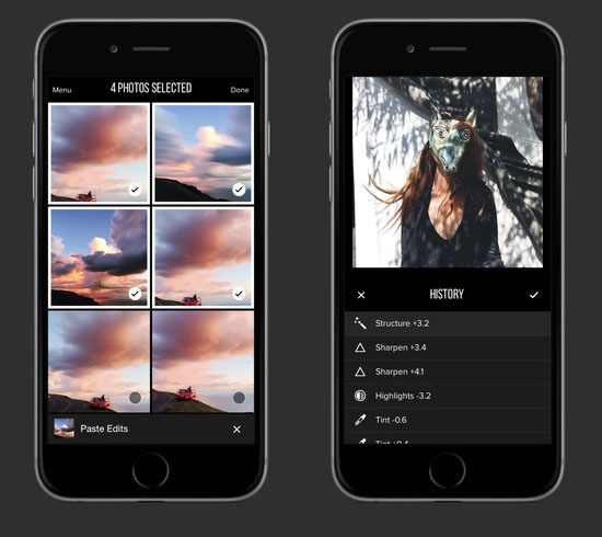 Фотографии можно редактировать с помощью набора различных инструментов – яркость, структура (structure), контрастность, теплота, цветовой сдвиг, насыщенность, резкость, света/тени, виньетирование и приглушение (fade). Инструмент История (History) позволяет пошагово откатить весь процесс назад, следя за изменениями на экране.